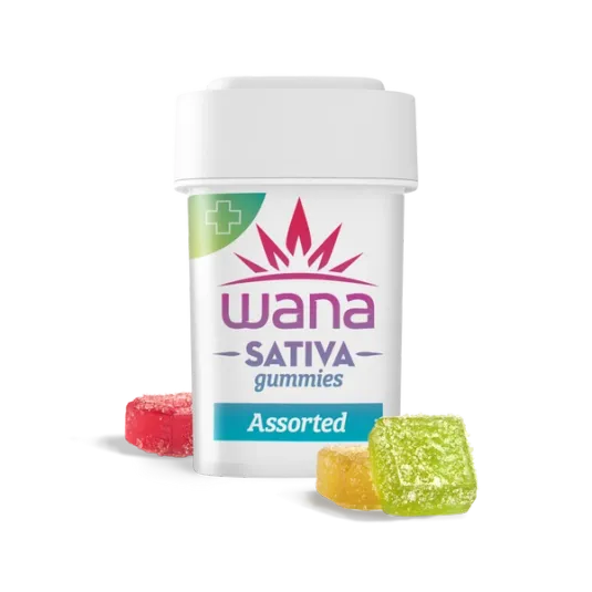 ASSORTED FLAVORS (MED) // SATIVA Wana Gummies, Infused with an uplifting terpene-enhanced sativa blend, our classic assorted pack comes with a combination of all-natural grape, raspberry, lemon, green apple and orange flavors, which taste like real fruit. ASSORTED FLAVORS (MED) // SATIVA Wana Gummies