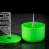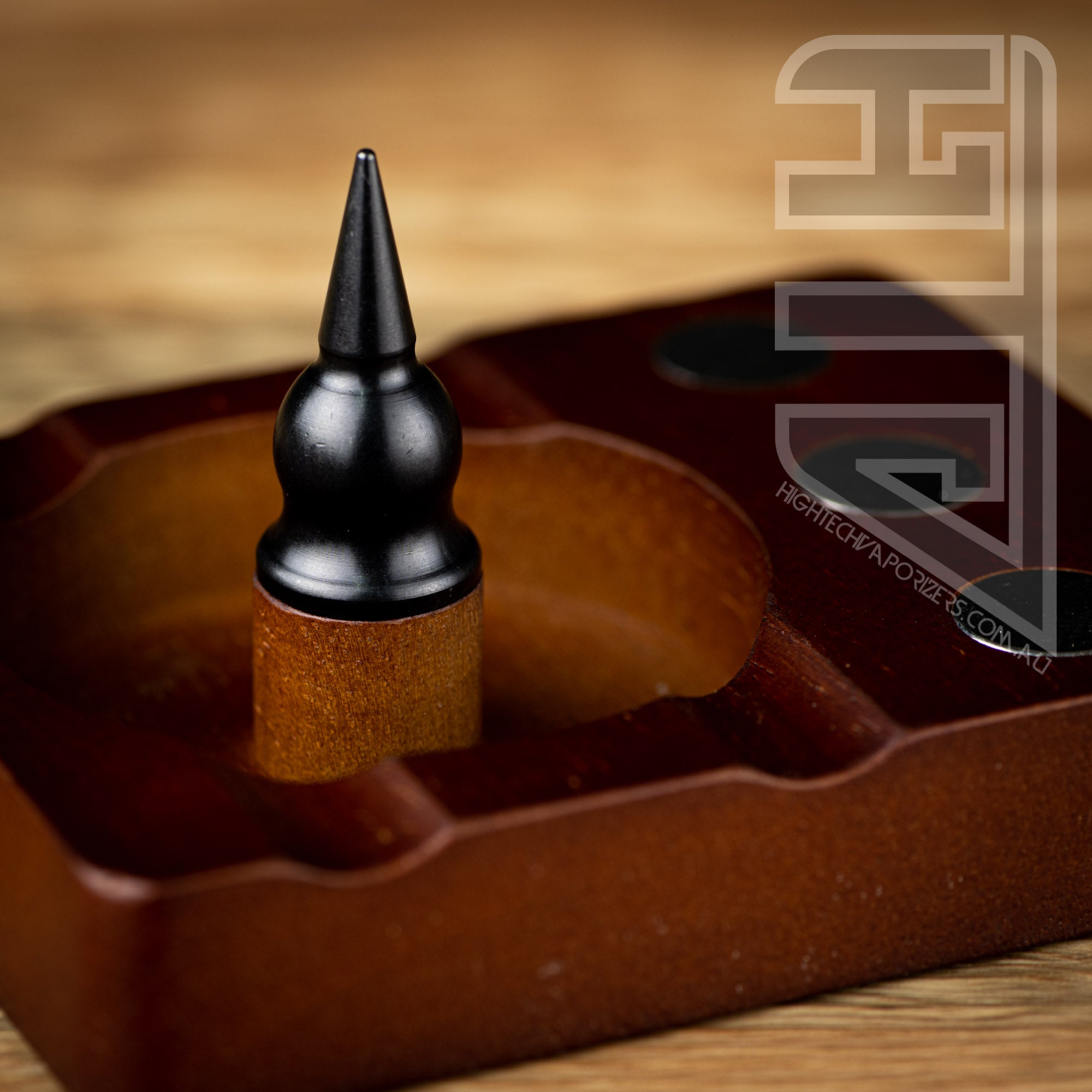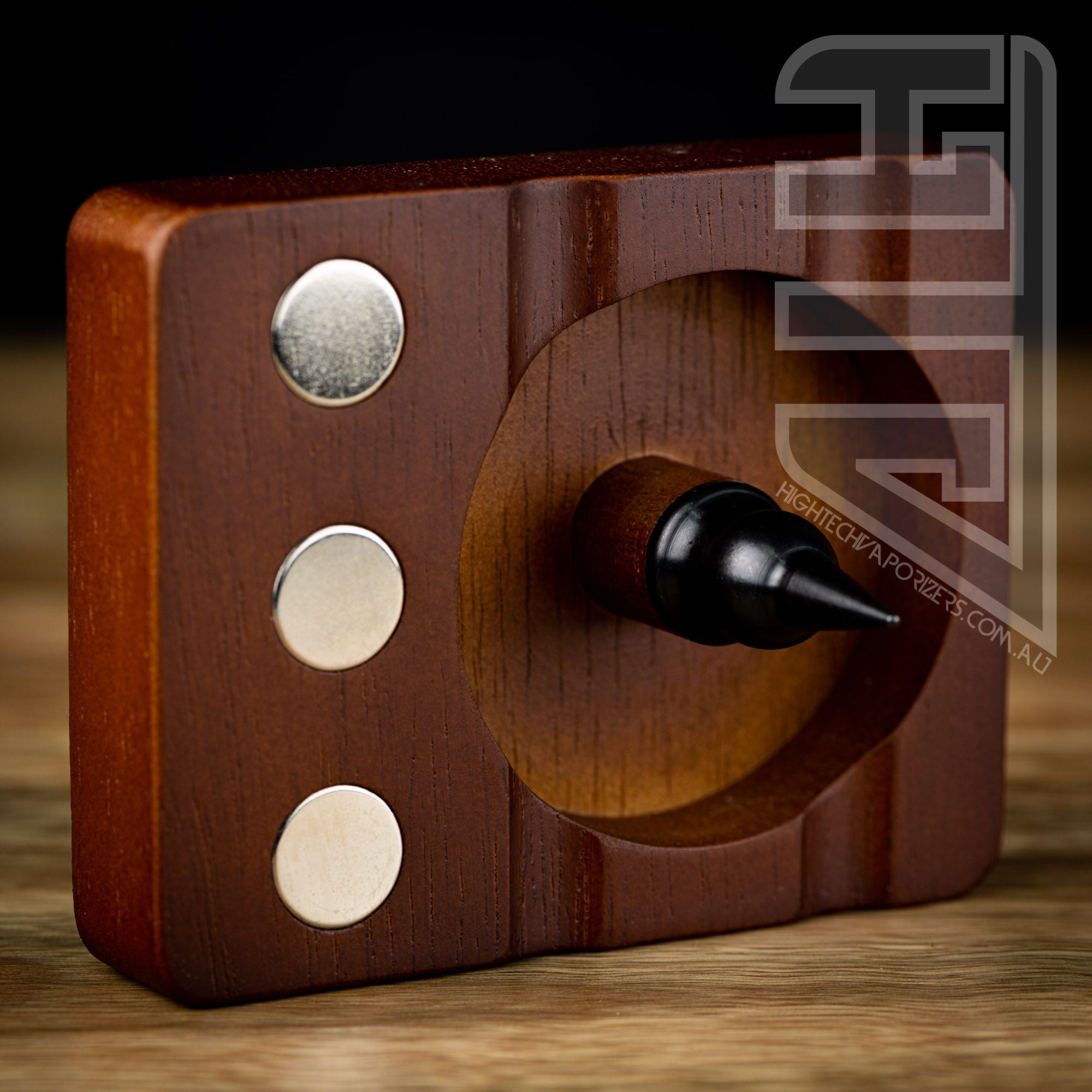 Built for use for Dynavap and other like devices. This wooden debowler stand has 3 magnets imbedded into the wood for holding your dynavaps and for removing dynavap caps. In the centre of the spent herb dish is a solid steel spike which helps dig out spent herb.
